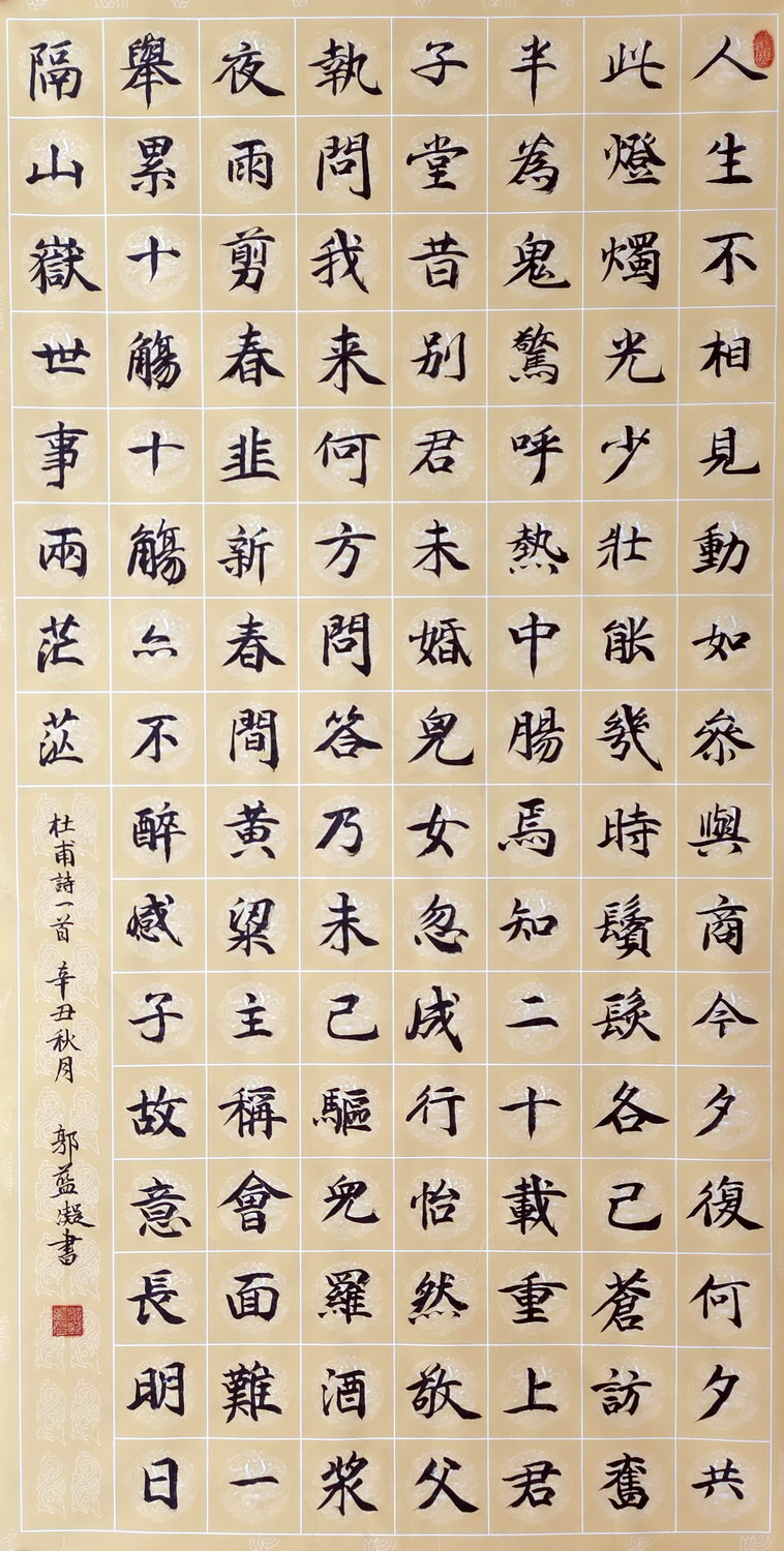 这幅楷书作品取法唐楷,法度谨严而不失灵动,整体呈现出端庄典雅、清劲醇和的艺术风貌。从章法布局来看,作品采用标准的方格界栏排布,字距与行距匀整均衡,通篇气息贯通、秩序井然,既保留了传统楷书的规整之美,又通过字势的细微变化避免了板滞之弊,体现出作者对整体章法的成熟把控能力。