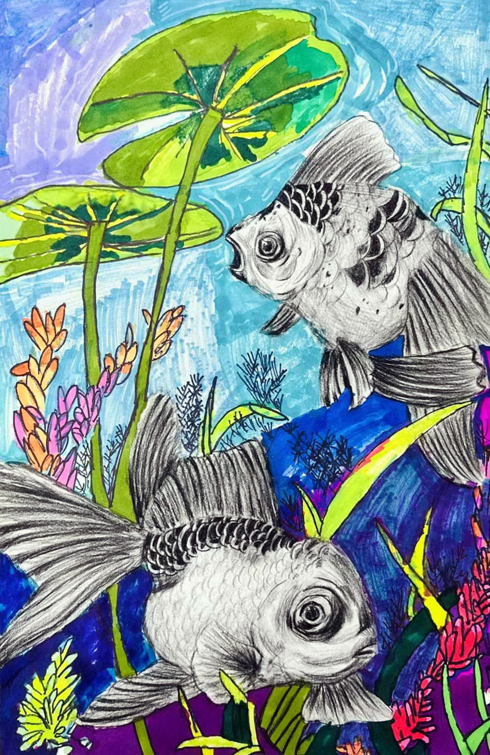 整体来看,这幅作品在写实造型、色彩表达与构图设计上均表现优异,既准确捕捉了金鱼的形态神韵,又通过富有感染力的色彩传递出童真童趣,是一幅兼具艺术性与观赏性的优秀少儿绘画作品,充分体现了小作者良好的艺术素养与创作潜力。