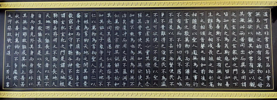 书法作品节录《道德经》,整体呈现出严谨规整的艺术质感,尽显小楷书法的典雅气质。作品以黑底金字为载体,视觉对比强烈,彰显出庄重肃穆的古典韵味。