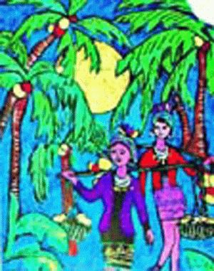 读过陶渊明诗的小朋友,可能还记得“戴月荷锄归”的佳句——劳动了一天的人们,顶着一轮明月,怀着轻松心情回家时的情境,是多么富有诗意!画中的两个黎族姑娘,挑着刚摘下来的椰果,同样“戴月归”,该不是唱着山歌,庆贺自己一天来的劳动收获吧!可以肯定11岁的罗筱璐读了不少诗歌,因此才会把诗和画融会在一起,表现出一个富有诗意的画面。“要学画,工夫在画外”,不错,学画如没有丰富的知识来做铺垫,就可能陷入”画匠“行列中去。这幅画用绿蓝冷调,衬托出明月和两位秀丽的黎家少女,姿态婆娑,似在舞蹈,形象优美动人。 | ||