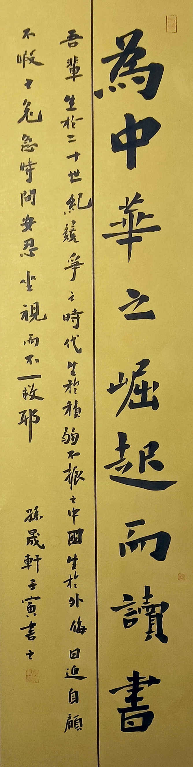 孙晟轩同学此幅软笔书法作品,以 “为中华之崛起而读书” 为内容,于 11 岁年龄段而言,体现出扎实的基础训练功底。笔法上,大字部分起收笔交代清晰,如 “中” 字竖画中锋行笔,线条挺劲且具力度;“崛” 字的转折处方折与圆转结合,可见对笔锋的控制已初具意识。小字落款以行书出之,笔画间映带自然,虽偶有笔力不均,却显少年书写的率真意趣。